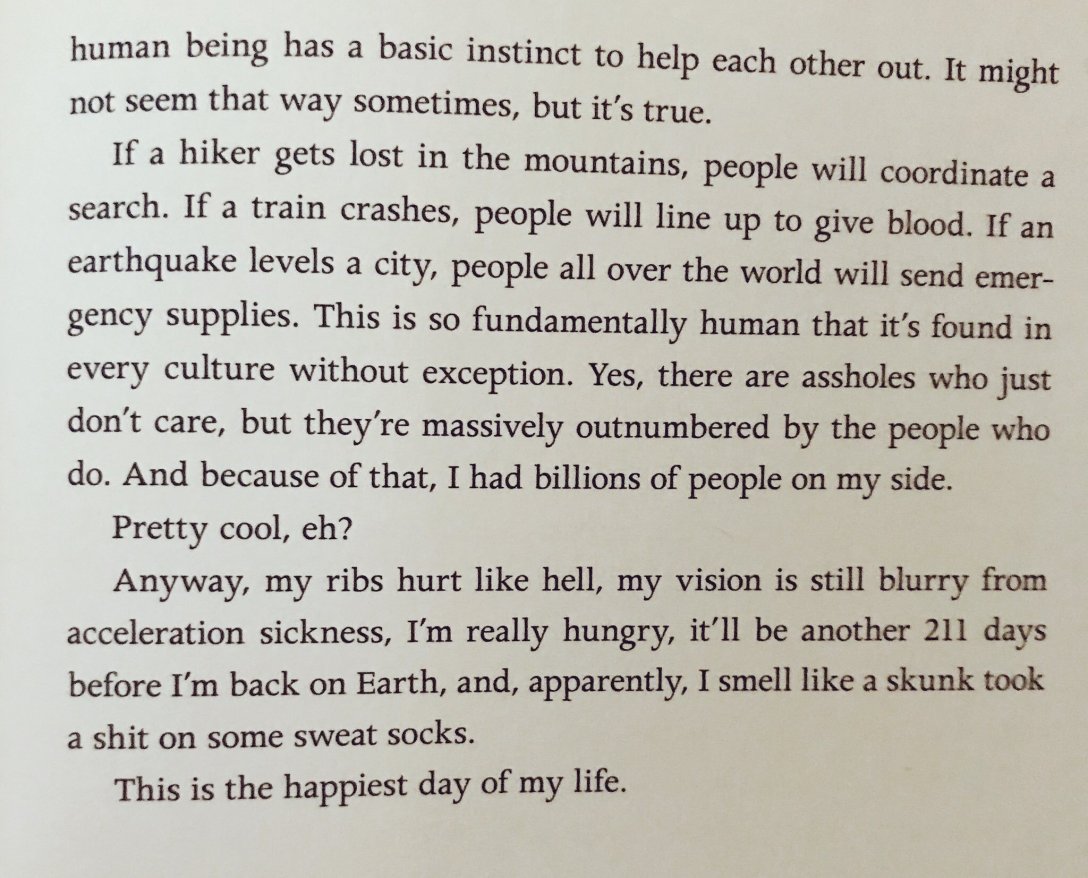 As a highly emotional and empathetic person, I am often overwhelmed by these things. I gasp when a friend offers to help me move and rarely read a letter from my grandma without crying (Don’t think for a second that I’m not tough as nails – I’ve got thick skin but a big heart). The way Andy Weir puts it is very easy for me to consume – He has us look at the bigger picture and reminds us that human beings have a “basic instinct to help each other out.”